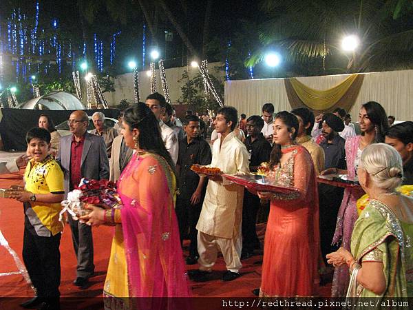女方捧類似台灣習俗的六禮或十二禮進場 (印度結婚是女方給男方下聘,新娘要給新郎十足豐厚的嫁妝)